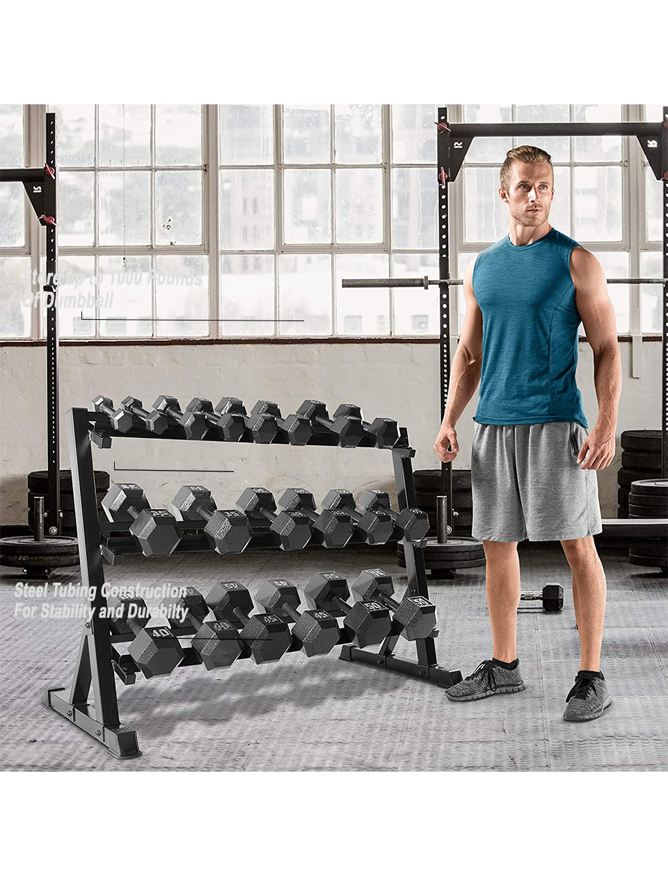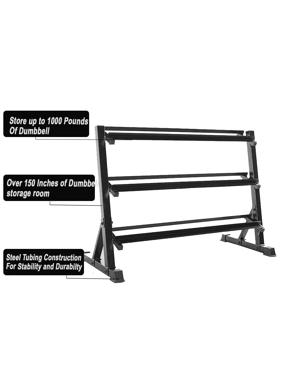 - The 1441 Fitness 3 Tier Dumbbell Rack boasts an ergonomic design and commercial-grade steel construction.