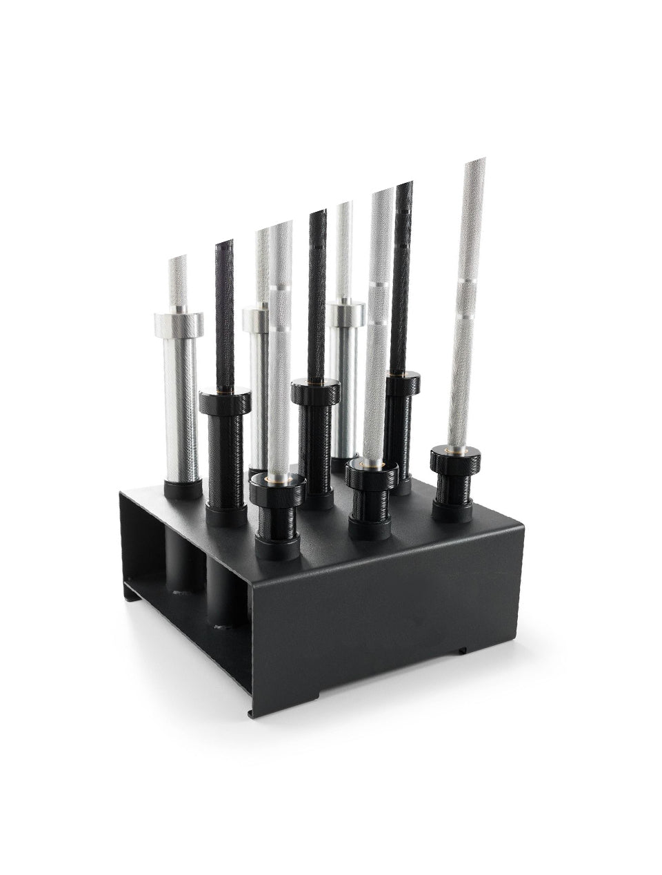 With a footprint of just 18”x18”, the 9 Bar Holder can instantly organize and improve the efficiency of any training space, be it a garage gym or large strength and conditioning facility. The vertical, sleeve-first storage design keeps your bars’ knurling out of harm’s way.