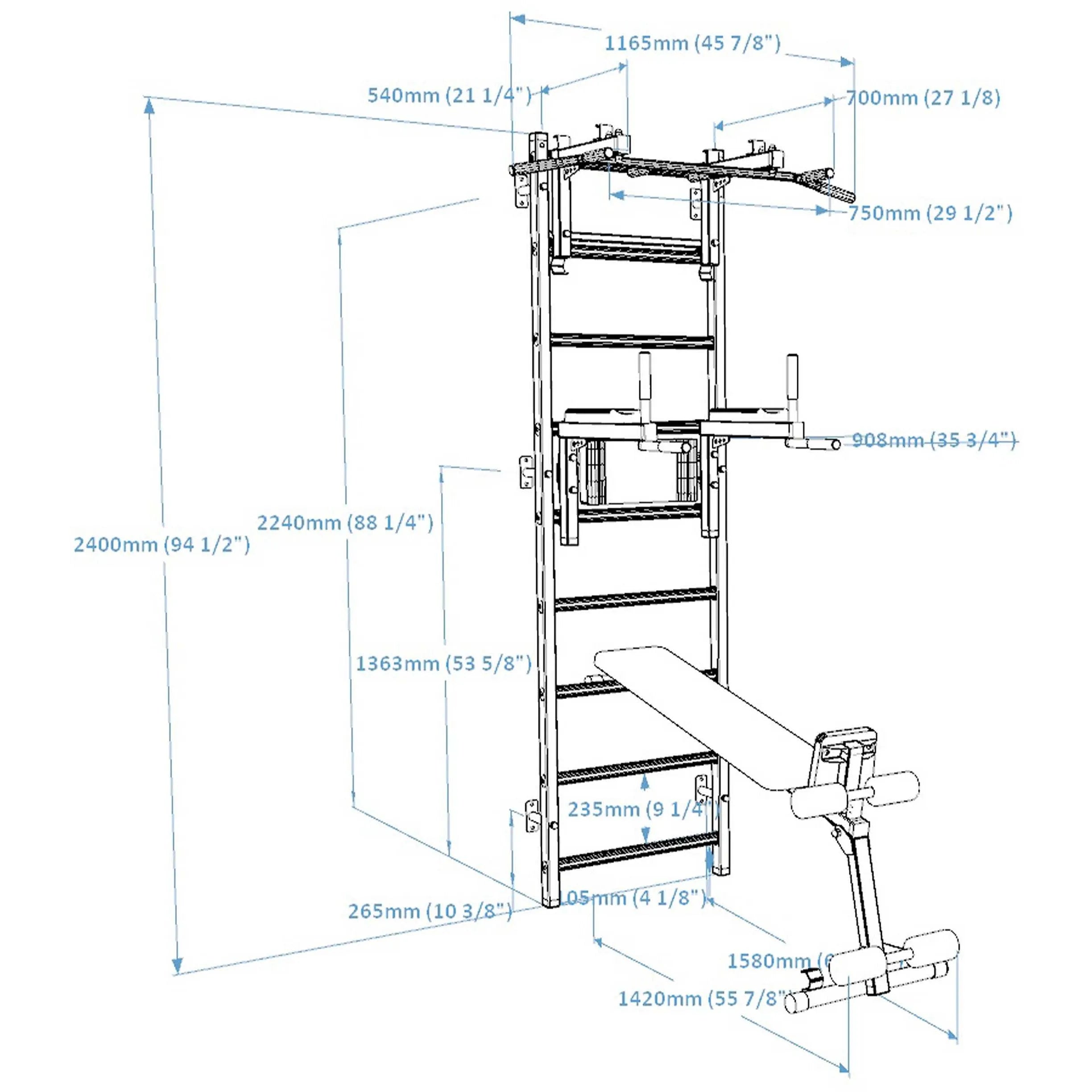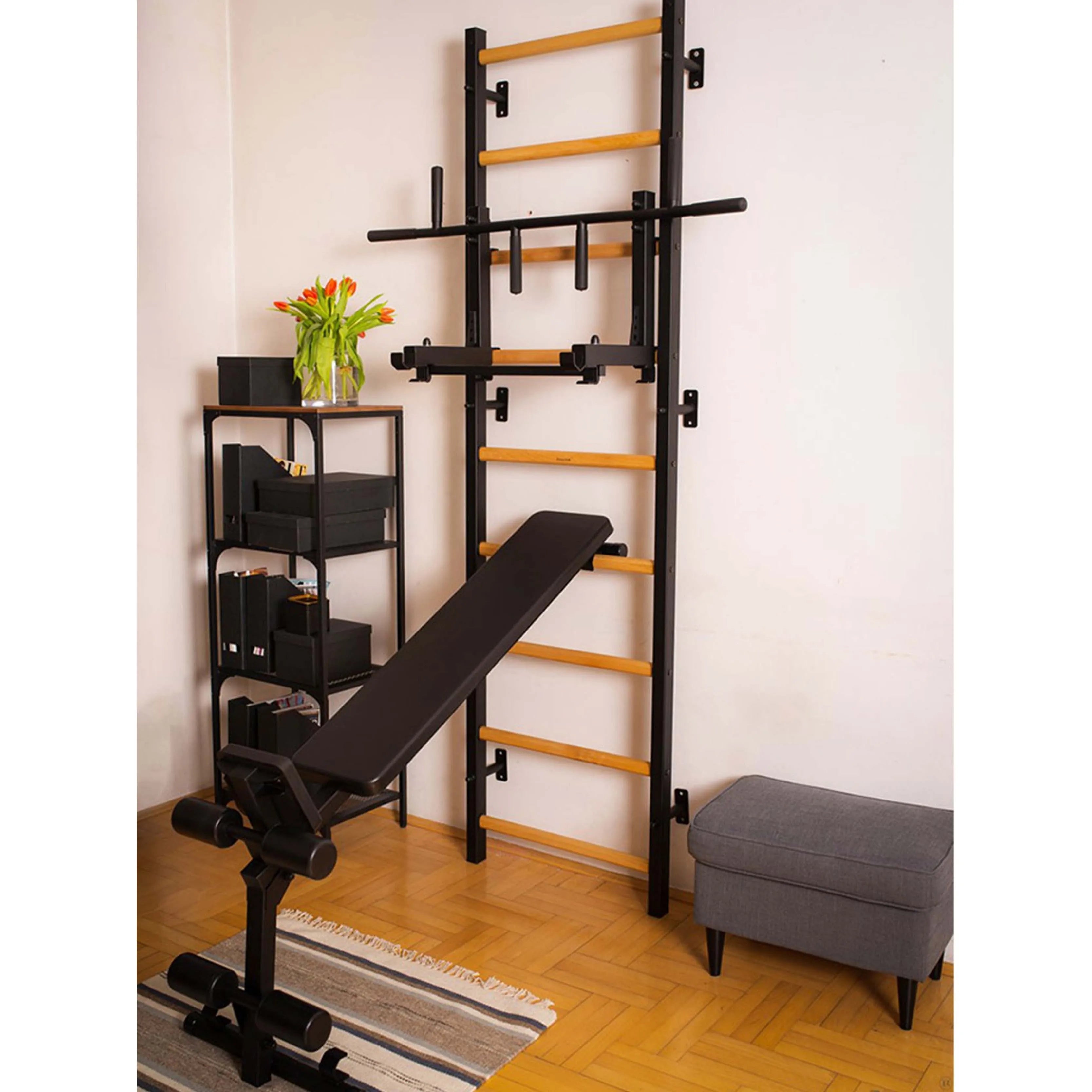 The BenchK wall bars combine multifunctionality, strength, and professional sports equipment design. It contains the following items: