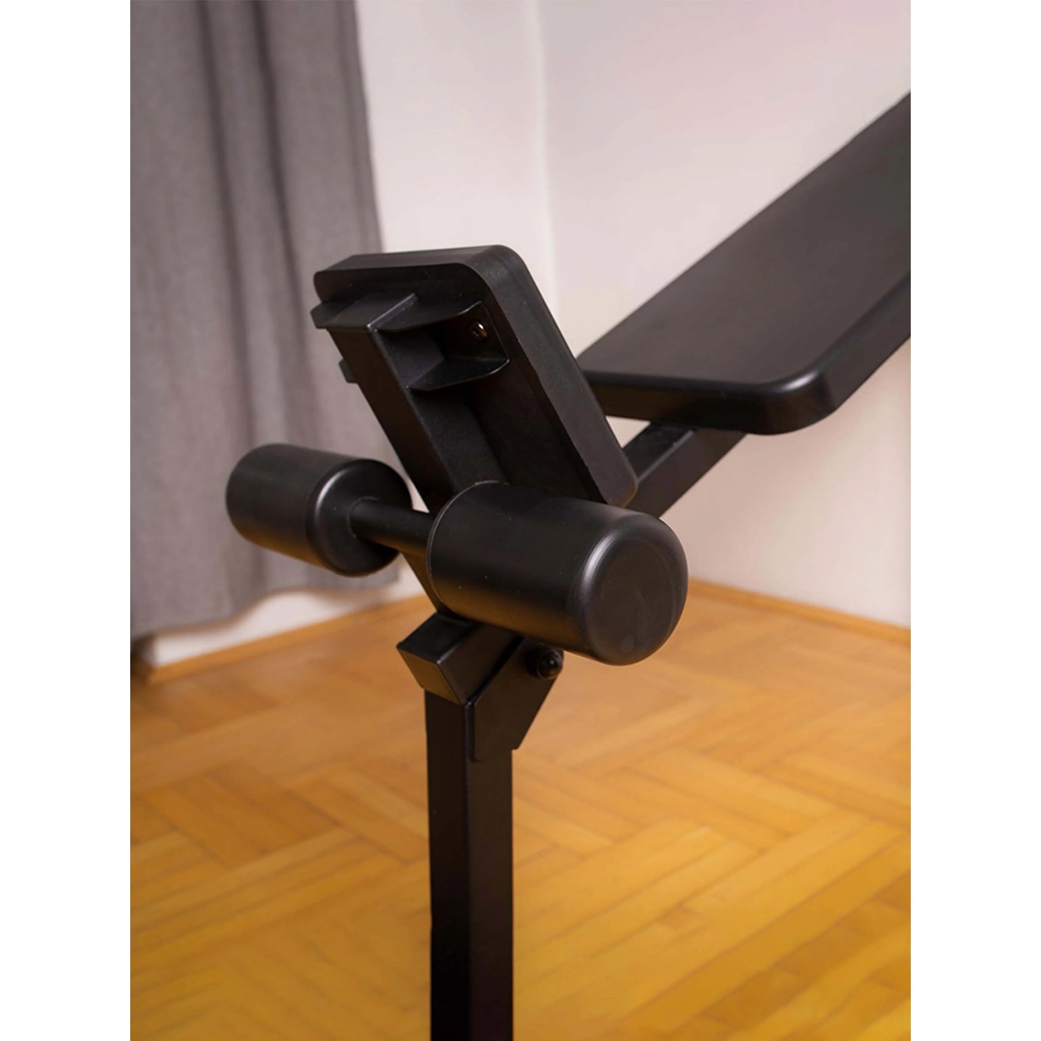The BenchK bench B1B does not contain any eco-leather or foam components. The backrest, small seat, and under-knee castors are all made of a single, integrated polyurethane piece. The bench can be used for a variety of exercises, including sit-ups, angular exercises with a bar and dumbbells, and training in a straight position because it has two sides and an extra seat.