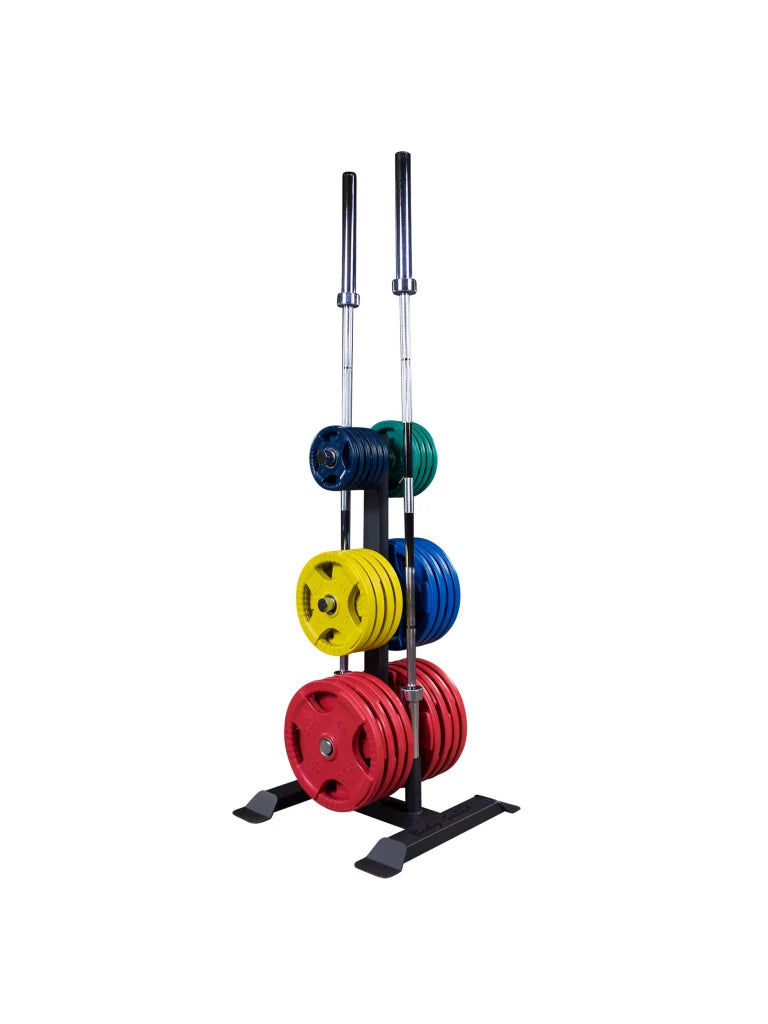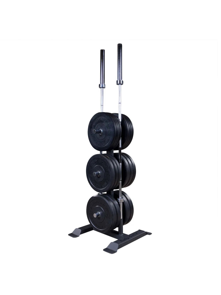 Two Olympic bar holders keep your barbells off the floor and provide a visually appealing equipment display, while six 9" chrome-plated weight horns can accommodate any size bumper or Olympic plates. A strong, reliable weight tree that is made to last a lifetime features welded metal foot and end caps, a commercial rating, and Body-Solid's industry-leading warranty.