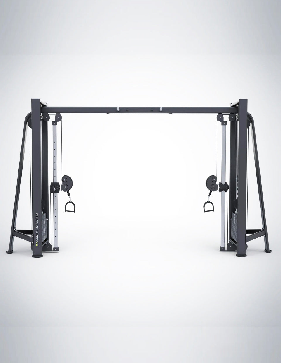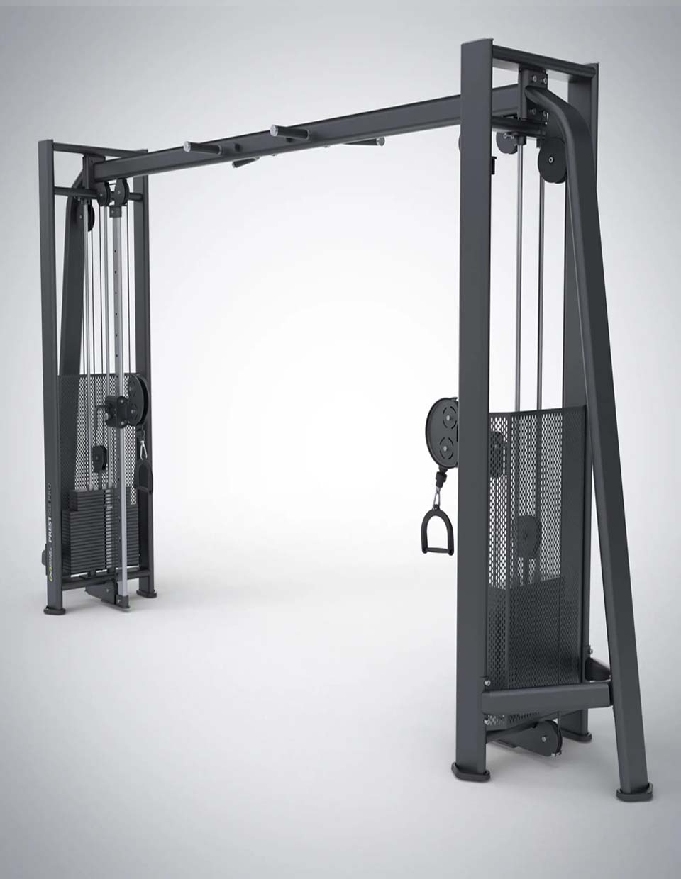The Fusion Pro Series Adjustable Cable Crossover is a self-contained cable crossover device that provides two sets of adjustable cable positions, allowing two users to execute different workouts at the same time, or individually.