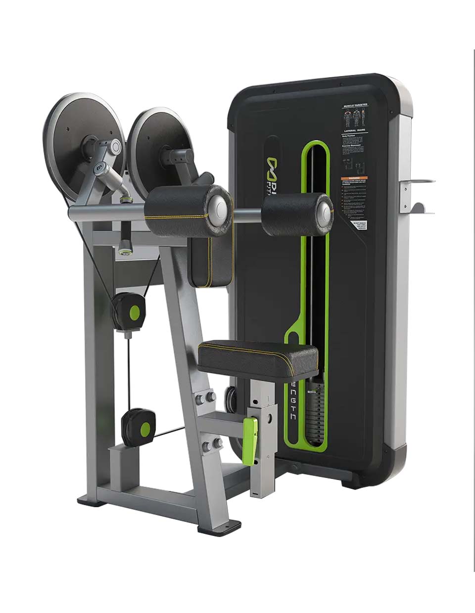 Lateral Raise is designed to allow exercisers to maintain a sitting posture and easily adjust the height of the seat to ensure that the shoulders are aligned with the pivot point for effective exercise. The upright open design makes the device easy to enter and exit.