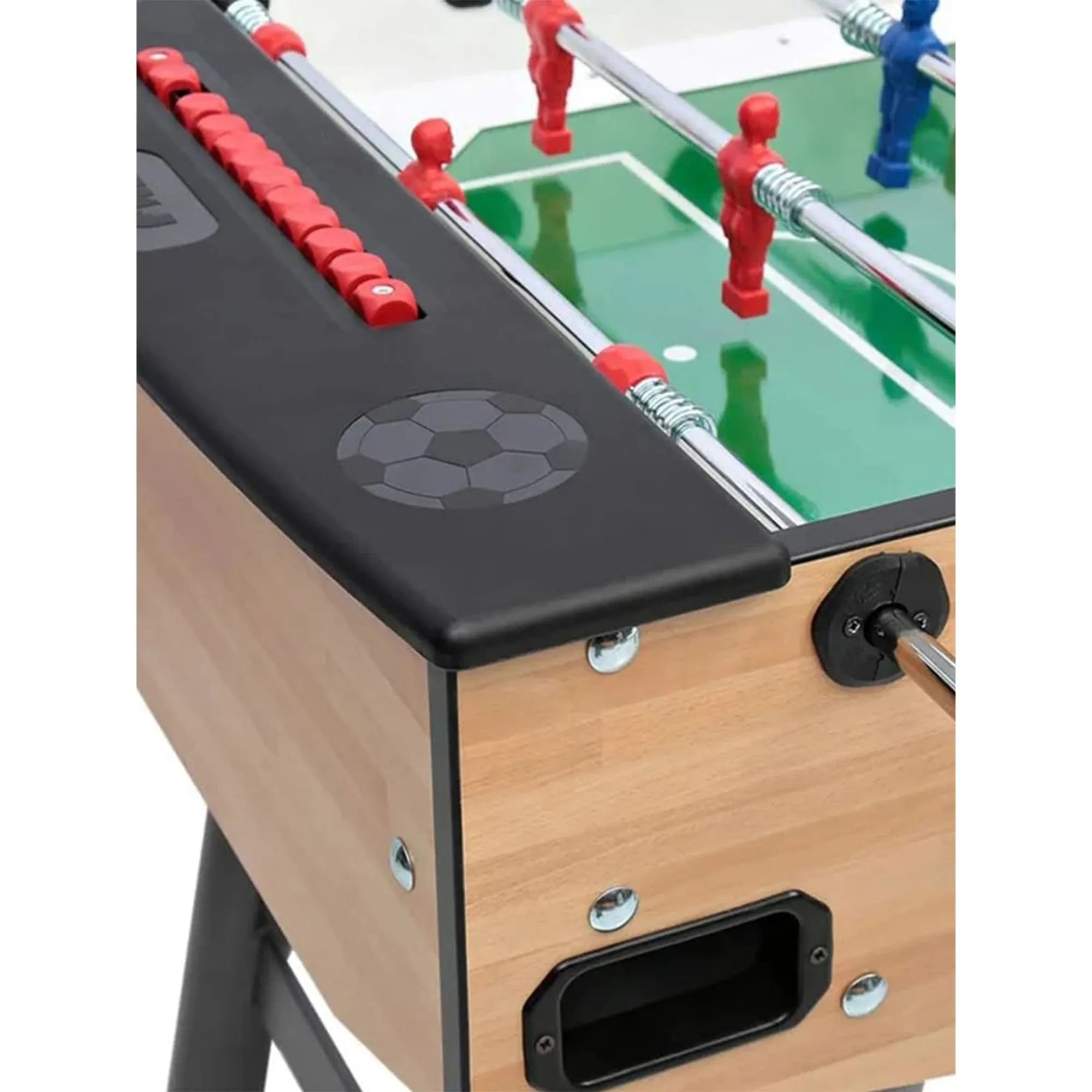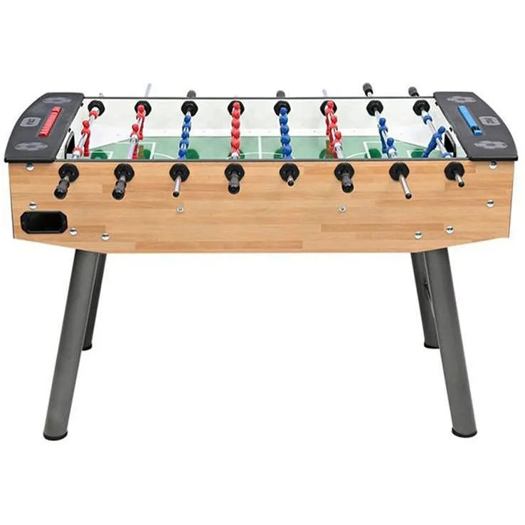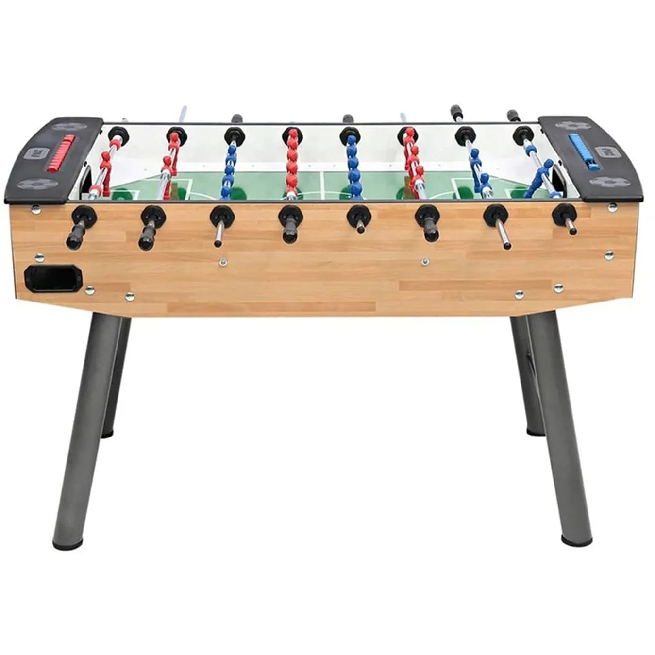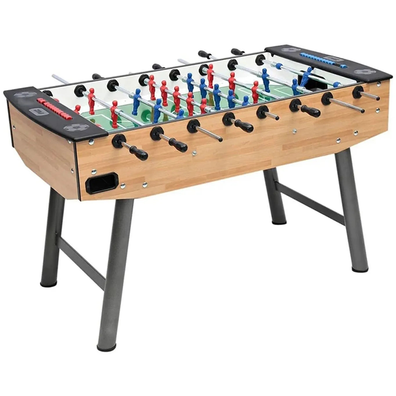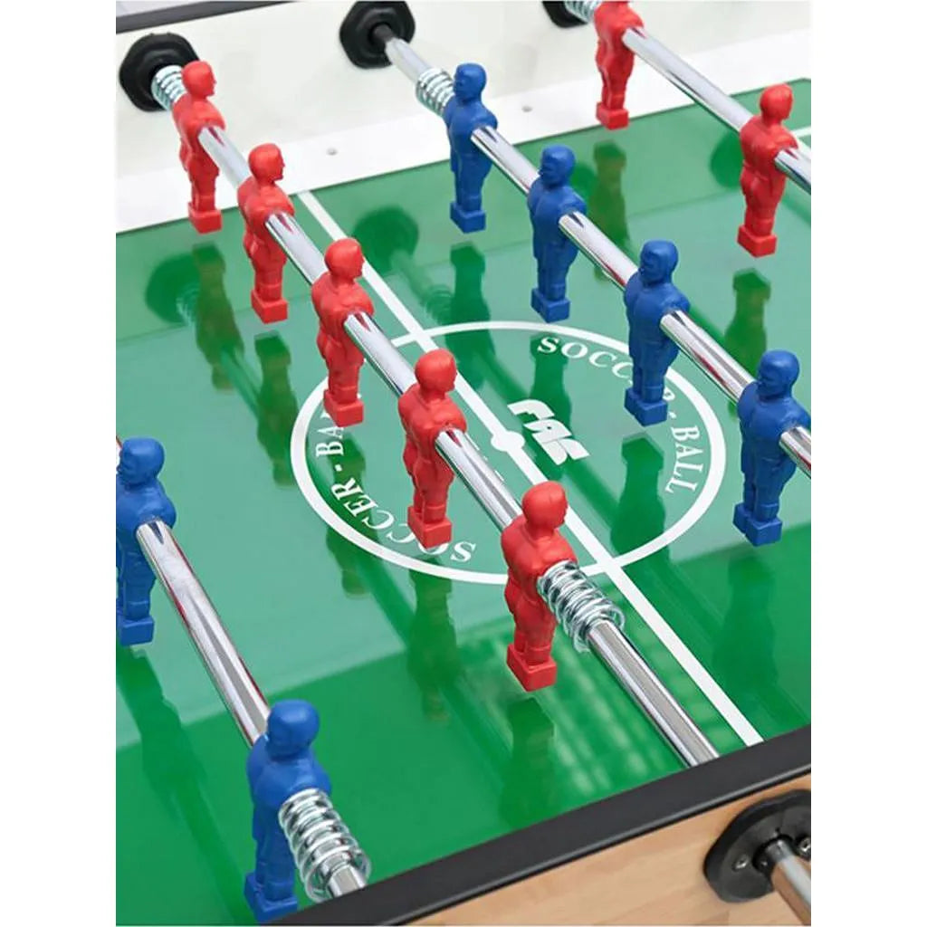 The FAS Football Table is a well-designed piece that offers durability and dynamic play features. It is protected with side coverings and plastic lamination, ensuring a sleek finish and long-lasting use. One of its standout features is the 180-degree rotating goalkeeper, which allows for enhanced control and more engaging gameplay. The table's legs are constructed from sturdy 70 mm metallic tubes, providing strong and stable support. Additionally, the side thickness of 22 mm contributes to the table's overall sturdiness. The handles are positioned at a comfortable height of 850 mm, making it suitable for most users. The playing field measures 1145 x 705 mm, offering ample space for an enjoyable game. Overall, the FAS Football Table combines robust construction with practical features, making it ideal for both casual and serious players.