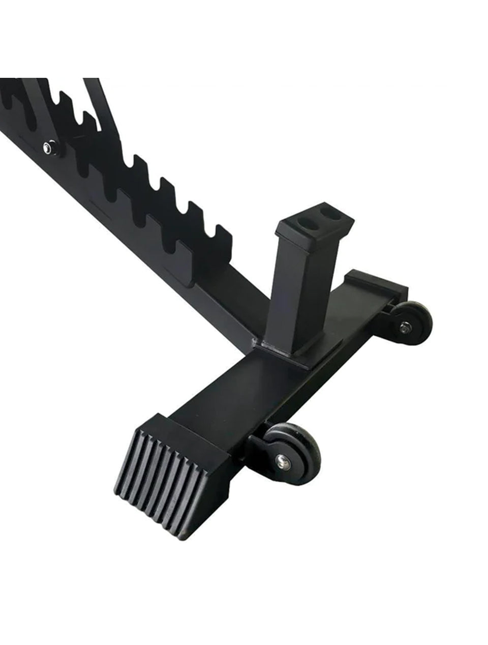 Designed to handle up to 300kg, this compact flat/incline/decline bench is strong enough for studio gym use, while designed to fit comfortably into any home. The convenient handle and dual rear transport wheels make moving, setting up and removing this bench one seamless, smooth motion.