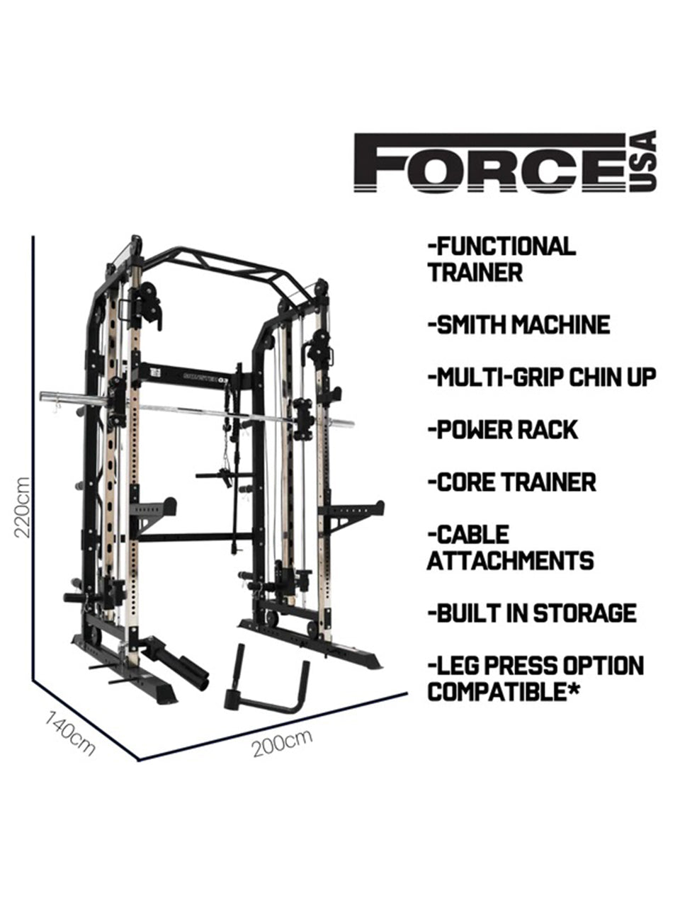 The all-new for 2019 Force USA G3 combines a power rack, smith machine, and a cable pulley system into an all-in-one compact strength-training machine.
