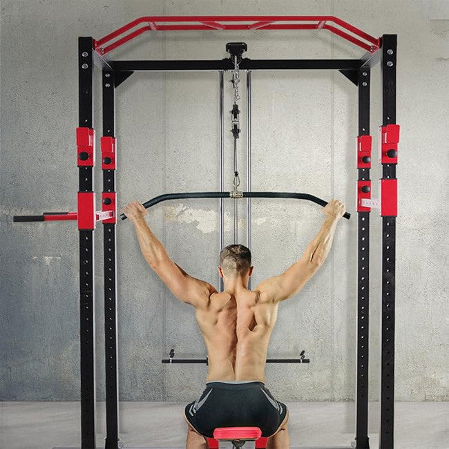 The Power Rack with lat machine comes with height-adjustable spotters and can be used with standard/Olympic barbells, as well as standard discs up to 200 kg – Color: Black/Red