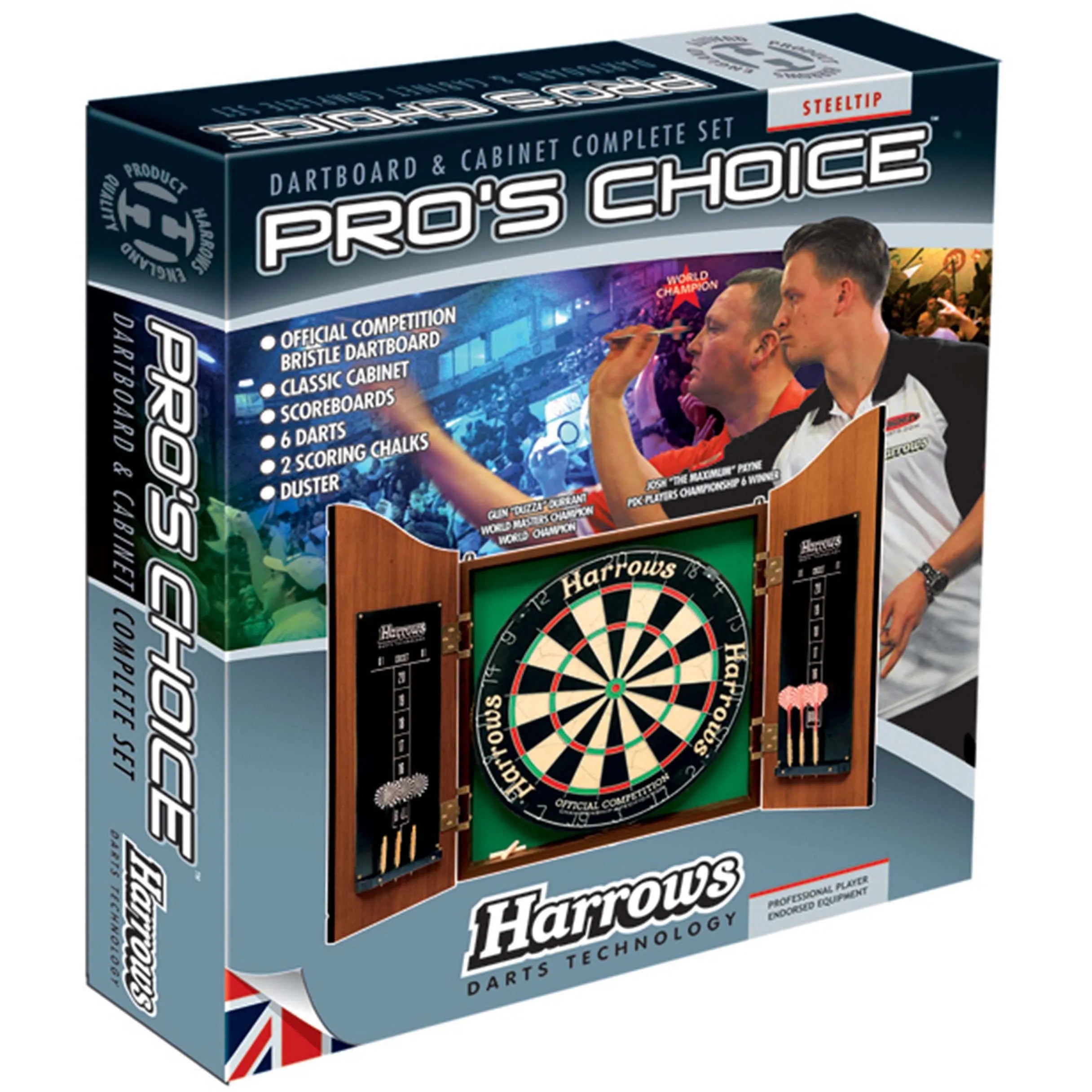 The Harrows Pro-Choice Complete Dart Set comes with everything you need to play darts and is ready to use. This set includes a classic wood cabinet, a bristle dartboard set with numbers and holders and folding doors of competition quality, two sets of brass darts, two scoring chalks, and a duster to clean the scores off. E endorsed by top darts players Wayne Mardle and Eric Bristow.