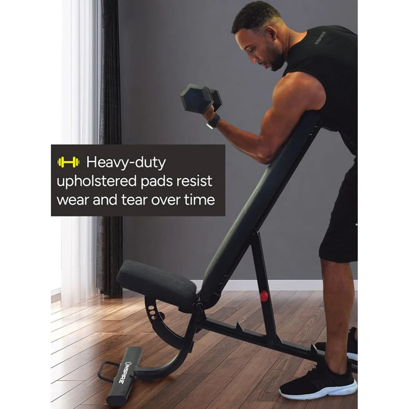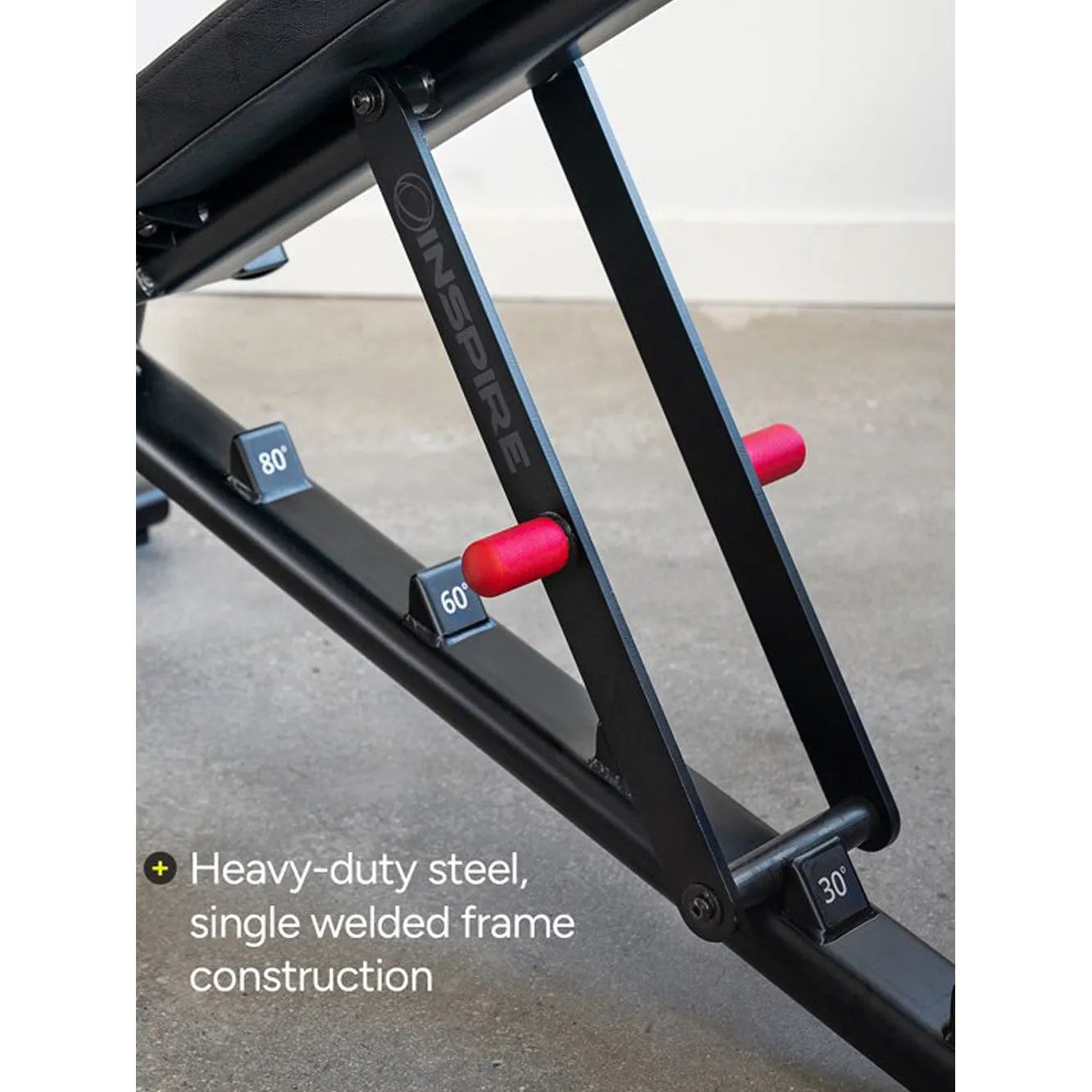 The weight bench's heavy-duty transport wheels and handy front transport handle make moving it a breeze. The bench is convenient to move around your home gym and store away when not in use because of its portability. The thick, extra-thick upholstered pads on the bench offer maximum comfort and stability as you perform different exercises. The dependable and easy-to-use Inspire Fitness Flat, Incline, Decline Workout Bench (FID 3) meets your various training needs. It is a useful addition to any home gym setup because of its traction grip handles, adjustable back pad angles, and easy transport features.