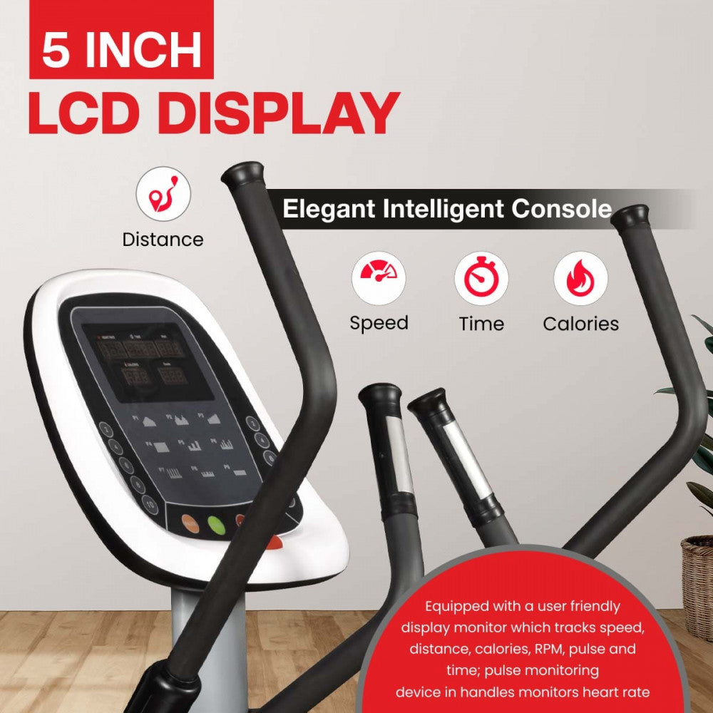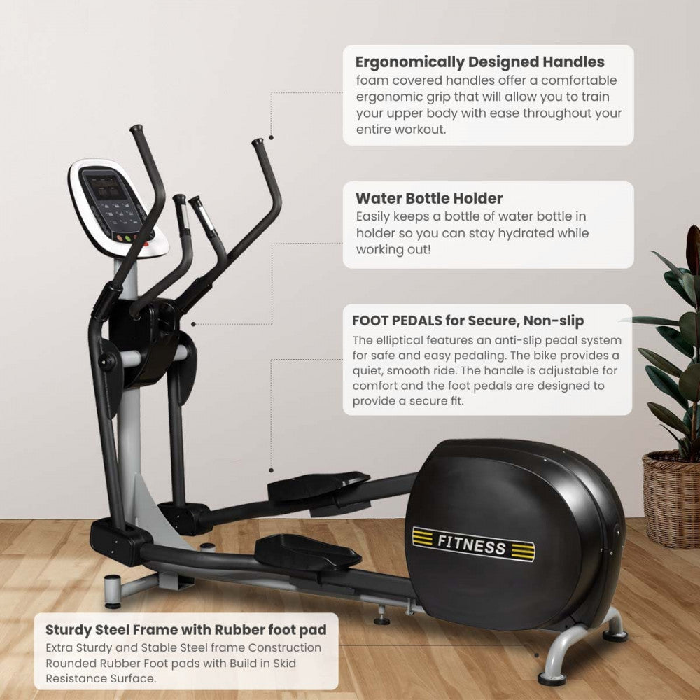 The MF-9317 Commercial Elliptical Cross Trainer Machine! This state-of-the-art machine is designed for commercial use and is equipped with a self-generator electromagnetic control flywheel for maximum user weight capacity of 150 kg. The 8 resistance levels provide a challenging workout, while the sturdy steel frame ensures durability. The 5-inch LCD display provides helpful information such as distance, speed, time, calories burned, and pulse rate.