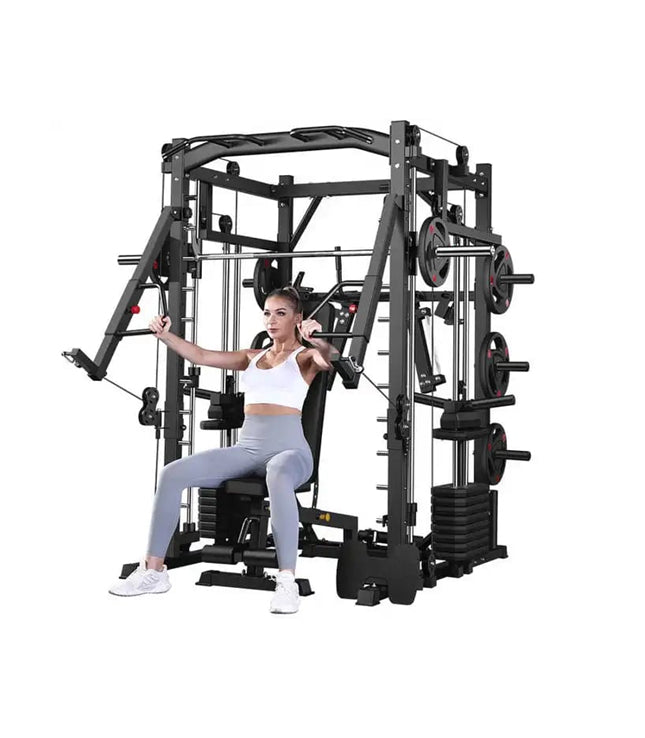 - Multifunctional 6-IN-1 Smith Machine, Power Rack, Barbell Landmine, Chin-up, Dips and Weight Storage.