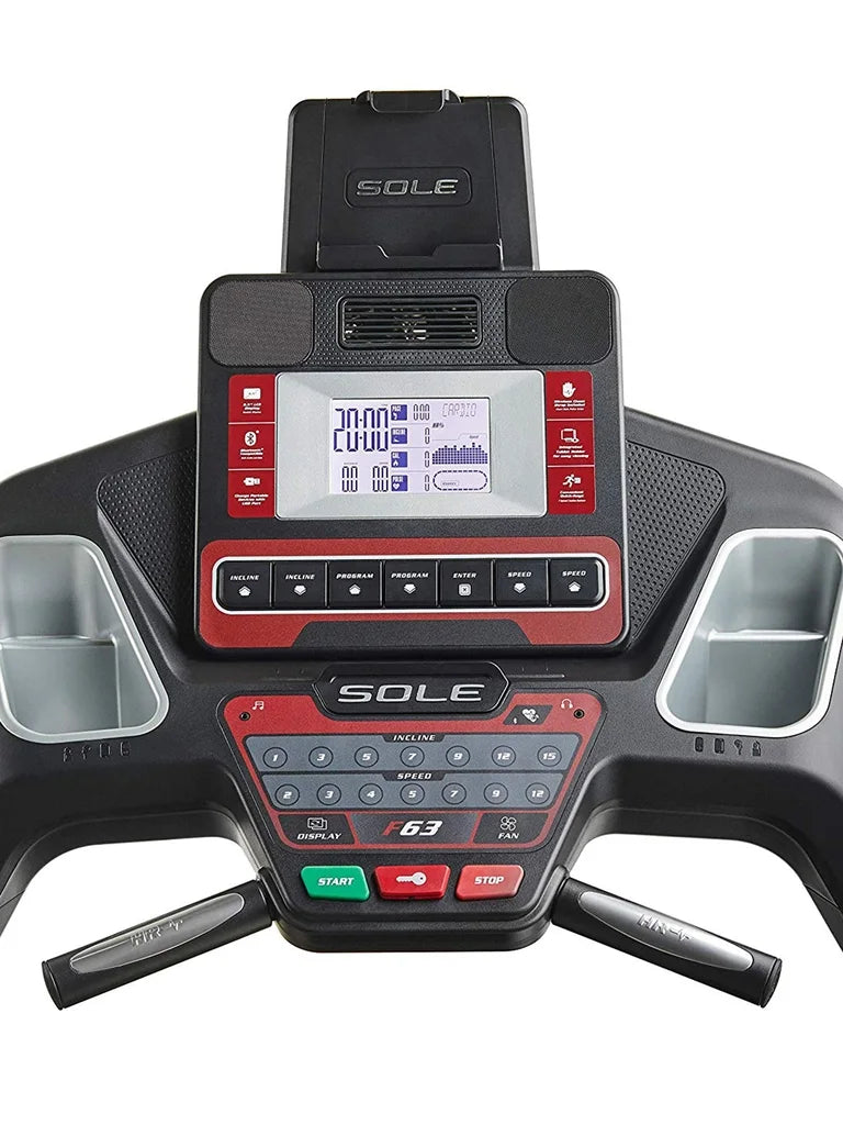 The armrests of the F63 include speed and incline controls in addition to cooling fans. The treadmill's console is easy to operate. The information shown includes speed, incline, time, distance traveled, calories, pulse, and pace. There is a Peak and Valley graph and a 1/4 mile track feature for different programs. You can enjoy your media player's music by using the console's built-in speakers.